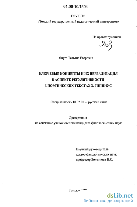 Диссертационное исследование посвящено изучению лексического воплощения ключевых концептов («молчание» - «слово», «жизнь» - «смерть», «божественное» - «диаволическое», «огонь» - «холод», «одиночество» -«соединение», «знание» - «незнание», «небывалое», «время», «пространство», «зеркало», «любовь, «душа») в поэтических текстах 3. Гиппиус в аспекте теории регулятивности.