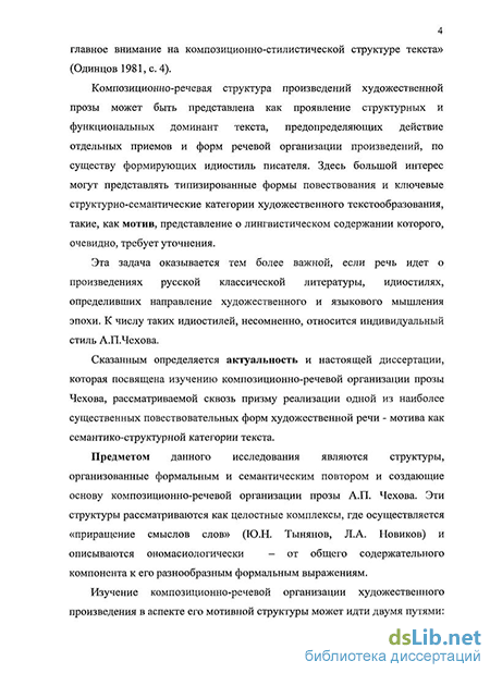 Чеховская проза неоднократно становились объектом изучения (Барлас Л.Г., Берковский Н.П., Бицилли П. М., Кожевникова Н.А., Кубасов А.В., Милых М.К., Полоцкая Э.А., Степанов А.Д., Сухих И.Н., Текучева И.В., Толстая Е,. Тюпа В.И., Цилевич Л.М., Чудаков А.П., Шмид В., Эткинд Е.Г., Eekman Т., Jackson R.L., O'Toole L.M., Turner C.J.G., Winner Т.). Тем не менее его идиостиль, лингвистические особенности композиции текстов этого классика наименее изучены в сравнении с другими представителями русской классической литературы второй половины XIX.