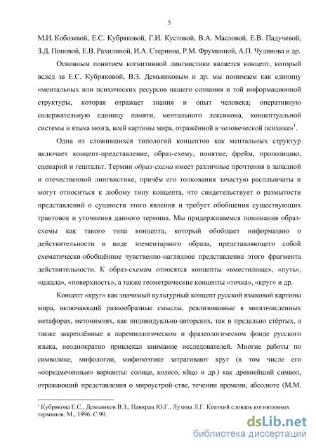 Проблемы толкования понятия «концепт», определения содержания концепта как ментальной единицы, его структуры, типологии продолжают оставаться в центре внимания современной лингвистики. Антропоцентрический подход к языку, предполагающий изучение различных проявлений личностного начала в языке, по мнению Е.С. Кубряковой, обеспечивает «выход через детальный анализ языковых форм со всей спецификой «упаковки» в них человеческих знаний к пониманию того, как работает человеческий разум»2. Рассмотрение языковых фактов с точки зрения отражения в них когнитивных процессов концептуализации и категоризации окружающего мира предполагает изучение когнитивных структур и их языковых репрезентаций3.