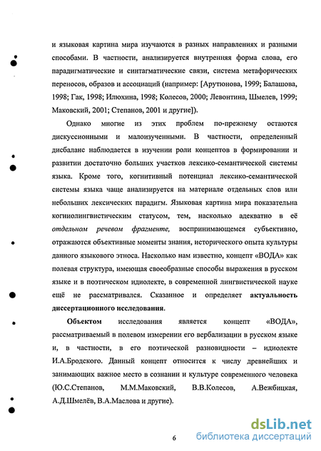 Однако многие из этих проблем по-прежнему остаются дискуссионными и малоизученными. В частности, определенный дисбаланс наблюдается в изучении роли концептов в формировании и развитии достаточно больших участков лексико-семантической системы языка. Кроме того, когнитивный потенциал лексико-семантической системы языка чаще анализируется на материале отдельных слов или небольших лексических парадигм. Языковая картина мира показательна когниолингвистическим статусом, тем, насколько адекватно в её отдельном речевом фрагменте, воспринимающемся субъективно, отражаются объективные моменты знания, исторического опыта культуры данного языкового этноса. Насколько нам известно, концепт «ВОДА» как полевая структура, имеющая своеобразные способы выражения в русском языке и в поэтическом идиолекте, в современной лингвистической науке ещё не рассматривался. Сказанное и определяет актуальность диссертационного исследования.