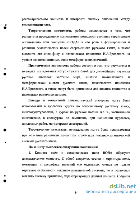 Теоретическая значимость работы заключается в том, что результаты проведенного исследования позволяют уточнить структурную организацию поля концепта «ВОДА» и его роль в формировании и развитии семантических полей современного русского языка, а также выяснить его специфику в поэтическом идиолекте И.А.Бродского на уровне как номинативных, так и метафорических значений.