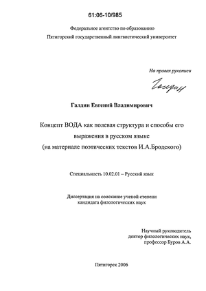 Структура диссертации. Работа состоит из Введения, трех глав, Заключения и Библиографического списка. Во Введении представлены тема, объект и предмет, цель, основные задачи и методы исследования. В первой главе рассмотрены вопросы: 1) понятие языковой личности, картины мира, концепта; 2) концепт как полевая структура; 3)семантические и метафорические поля, как отражение языковой картины мира. Во второй главе 1) представлена общая характеристика номинативного поля ВОДА; 2) состав и структура номинативного поля ВОДА в современном русском языке; 3) состав и структура метафорического поля ВОДА в современном русском языке; 4) описание номинативного поля ВОДА, как источника формирования метафорического поля. В третьей главе рассматриваются 1) основные черты поэтического языка; 2) номинация и значение в поэтическом языке; 3) номинативные и метафорические поля в поэтическом идиолекте Бродского. В Заключении представлены результаты исследования. Библиографический список содержит 241 наименование отечественной и зарубежной научной литературы.