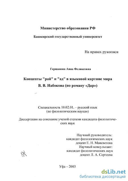 Гершанова Анна Феликсовна. Концепты "рай" и "ад" в языковой картине мира В. В. Набокова : По роману "Дар" : диссертация ... кандидата филологических наук : 10.02.01.- Уфа, 2003.- 226 с.: ил. РГБ ОД, 61 03-10/1000-3