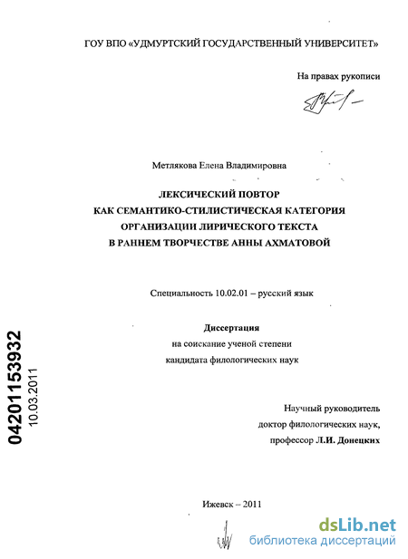 Цель диссертационного исследования состоит в изучении индивидуальных семантико-стилистических особенностей лексического повтора в ранних произведениях А. Ахматовой.