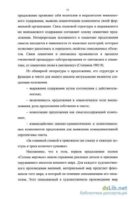Из обширной литературы о предложении, его структуре и функции в тексте для нашего анализа актуальными являются следующие положения: - выражение содержания путем соотнесения с действитель ностью; - включенность предложения в семантическое поле высказывания, роль предложения собственно в тексте; - композиция предложения как смыслосодержащий компонент; - взаимодействие лексико-грамматических и композиционных компонентов предложения для выявления коммуникативной перспективы текста. «За глиняной стенкой в тревожном сне слышу я тяжелую поступь и треск колючего сушняка».