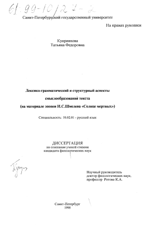 Апробация работы. Основные теоретические положения и практические выводы отражены в трех ігубликациях и обсуждались на XXVI и XXVII межвузовских конференциях преподавателей и аспирантов Санкт-Петербургского университета (1997, 1998), на международной научно-методической конференции «Вопросы языковой политики на современном этапе: теория и практика» (Санкт-Петербург, 1998), а также на лингвистическом семинаре аспирантов и на заседании кафедры русского языка для иностранных студентов-филологов СПбГУ. По теме диссертационного исследования прочитан доклад на VI Крымских международных Шмелевских чтениях.