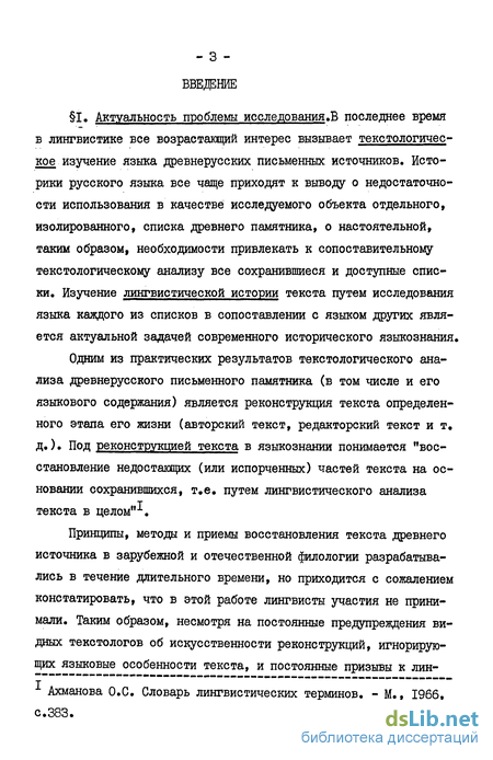 Проблема реконструкции языка древнерусского письменного памятника состоит прежде всего в том, что до сих пор четко не определены ее задачи и цель, не разработана методика отбора и анализа материала имеющихся списков, не сформулированы лингвистические принципы восстановления текста. Детальная разработка теоретических основ текстологического исследования языка древних источников, в том числе основ лингвистической реконструкции текста, становится ныне_все-более насущной потребностью как текстологии вообще, так и истории языка в частности. Решение этой задачи, несомненно, может быть достигнуто только в результате практического исследования всего рукописного наследия Древней Руси, в результате многократных попыток реконструкций текстов.