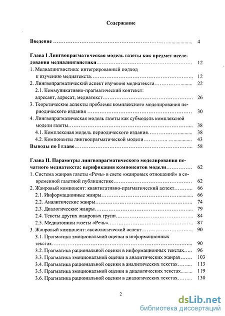 Первая глава содержит основные теоретические положения медиалин-гвистики, лингвопрагматики, функциональной стилистики, теории дискурса, теории коммуникации, теории моделирования периодических изданий - направлений гуманитарной науки, которые составляют теоретическую и методологическую базу нашего исследования. В первой главе обосновывается лингвопрагматический подход к изучению медиатекста как базовой категории медиалингвистики и представляются, описываются структурные компоненты лингвопрагматической модели газеты. Во второй главе анализируются компоненты лингвопрагматической модели конкретного периодического издания - общегородской газеты «Речь» г. Череповца Вологодской области.