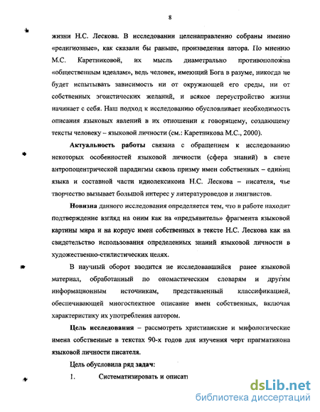 Мы считаем имя собственное частью словаря (идиолекта) писателя и опираемся в работе на тезис В.В, Леденевой: «Словарь Н.С. Лескова хранит зафиксированную в словах информацию о его ментально-лингвальной деятельности в течение жизни как представителя русского народа, является частным и фрагментарным отражением русской языковой картины мира» (ЛеденеваВ.В., 2000а, 14).