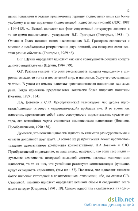 «Идиолект», англ. idiolect, (индивидуальный говор, индивидуальный язык). Совокупность индивидуальных (профессиональных, социальных, территориальных, психофизических и др.) особенностей, характеризующих речь данного индивида; индивидуальная разновидность языка (Ахманова, 1966 : 165). В Литературоведческом энциклопедическом словаре В.П. Григорьев раскрывает значение терминов идиолект/ идиостиль, считая их смежными, дублетными понятиями и отдавая предпочтение термину «идиостиль» лишь как более удобному в плане выражения (идиостилевой, идиостилистический) (ЛЭС, 1987 : 114-115). «...Всякий идиолект как факт современной литературы является в то же время идиостилем», - утверждает В.П. Григорьев (Григорьев, 1983 : 4). Однако в более поздних своих исследованиях В.П. Григорьев склоняется к мнению о необходимом разграничении двух понятий, «за которыми стоят все-таки разные объекты» (Григорьев, 1989 : 6).