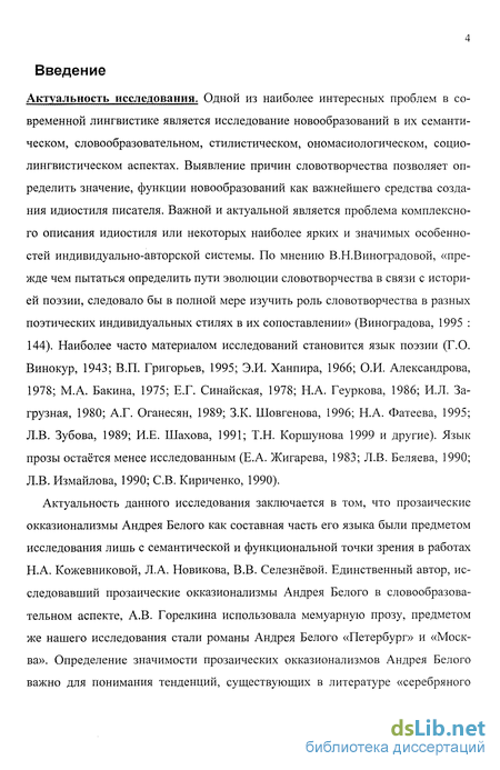 Актуальность данного исследования заключается в том, что прозаические окказионализмы Андрея Белого как составная часть его языка были предметом исследования лишь с семантической и функциональной точки зрения в работах Н.А. Кожевниковой, Л.А. Новикова, В.В. Селезнёвой. Единственный автор, исследовавший прозаические окказионализмы Андрея Белого в словообразовательном аспекте, А.В. Горелкина использовала мемуарную прозу, предметом же нашего исследования стали романы Андрея Белого «Петербург» и «Москва». Определение значимости прозаических окказионализмов Андрея Белого важно для понимания тенденций, существующих в литературе «серебряного