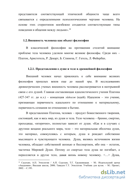 Внешний человек начал привлекать к себе внимание великих философов прошлых веков еще до нашей эры. В исследованиях древнегреческих ученых внешность человека рассматривается в неотрывной связи с его душой. Главная составляющая идеалистического учения Платона (427-347 гг. до н.э.) – концепция эйдосов (идей). Идеализм – это учение, признающее первичность идеального по отношению к материальному, первичность сознания по отношению к бытию.