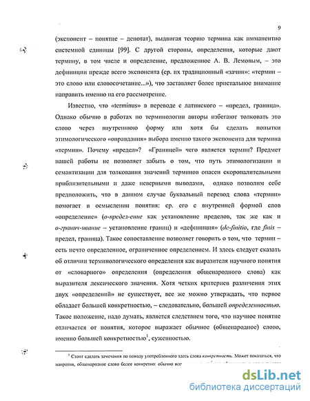 Известно, что «terminus» в переводе с латинского - «предел, граница». Однако обычно в работах но терминологии авторы избегают толковать это слово через внутреннюю форму или хотя бы сделать попытки этимологического «оправдания» выбора именно такого экспонента для термина «термин». Почему «предел»? «Границей» чего является термин? Предмет нашей работы не позволяет забыть о том, что путь этимологизации и семантизации для толкования значений терминов опасен скоропалительными приблизительными и даже неверными выводами, однако позволим себе предположить, что в данном случае буквальный перевод слова «термин» помогает в осмыслении понятия: ср. его с внутренней формой слов «определение» {о-предсл-ение как установление пределов, так же как и о-гранич-ивтше - установление границ) и «дефиниция» (de-finitio, тс finis -предел, граница). Такое сопоставление позволяет говорить о том, что термин -есть нечто определенное, ограниченное определением. И здесь следует сказать об отличии терминологического определения как выразителя научного понятия от «словарного» определения (определения общенародного слова) как выразителя лексического значения. Хотя четких критериев различения этих двух «определений» не существует, все же можно утверждать, что первое обладает большей конкретностью, - следовательно, большей определенностью. Такое положение, надо думать, является следствием того, что научное понятие отличается от понятия, которое выражает обычное (общенародное) слово, именно большей конкретностью , суженностыо.