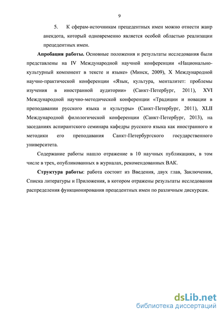 «Национально-культурный компонент в тексте и языке» (Минск, 2009), X Международной научно-практической конференции «Язык, культура, менталитет: проблемы изучения в иностранной аудитории» (Санкт-Петербург, 2011), XVI Международной научно-методической конференции «Традиции и новации в преподавании русского языка и культуры» (Санкт-Петербург, 2011), XLII Международной филологической конференции (Санкт-Петербург, 2013), на заседаниях аспирантского семинара кафедры русского языка как иностранного и методики его преподавания Санкт-Петербургского государственного университета.