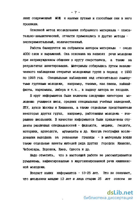 Работа базируется на собранном автором материале - около 4000 слов и выражений. Она основана на записях речи молодежи при непринужденном общзнии в кругу сверстников, а также на результатах анкетирования, материалы собирались путем невкл»-чеиного наблюдения открытых молодежных групп в период с 1990 по 1993 год. Специальные наблюдения над относительно замкнутыми группами молодежи, например, такими, как панки, хайлай-фисты, наркоманы, любера и т. п., в задачу автора не входили.