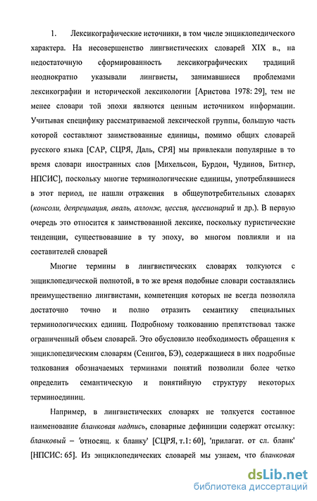 1. Лексикографические источники, в том числе энциклопедического характера. На несовершенство лингвистических словарей XIX в., на недостаточную сформированность лексикографических традиций неоднократно указывали лингвисты, занимавшиеся проблемами лексикографии и исторической лексикологии [Аристова 1978: 29], тем не менее словари той эпохи являются ценным источником информации. Учитывая специфику рассматриваемой лексической группы, большую часть которой составляют заимствованные единицы, помимо общих словарей русского языка [САР, СЦРЯ, Даль, СРЯ] мы привлекали популярные в то время словари иностранных слов [Михельсон, Бурдон, Чудинов, Битнер, НПСИС], поскольку многие терминологические единицы, употреблявшиеся в этот период, не нашли отражения в общеупотребительных словарях (консоли, депрециация, аваль, аллоюіс, цессия, цессионарий и др.). В первую очередь это относится к заимствованной лексике, поскольку пуристические тенденции, существовавшие в ту эпоху, во многом повлияли и на составителей словарей