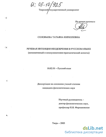 Данное диссертационное исследование посвящено коммуникативно-прагматическому описанию речевой интенции с общим значением неодобрения. Речевая интенция оказывается смыслообразующей интенциональной основой любого высказывания, поэтому именно она определяет содержание коммуникативного акта, организует и определяет его речедеятельную силу. В русском языке речевая интенция со значением неодобрения воплощается в разнообразных речевых актах и дискурсах.