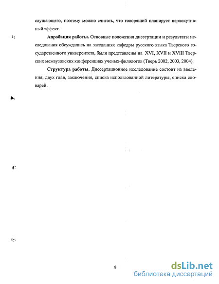 Апробация работы. Основные положения диссертации и результаты исследования обсуждались на заседаниях кафедры русского языка Тверского государственного университета, были представлены на XVI, XVII и XVIII Тверских межвузовских конференциях ученых-филологов (Тверь 2002, 2003,2004).