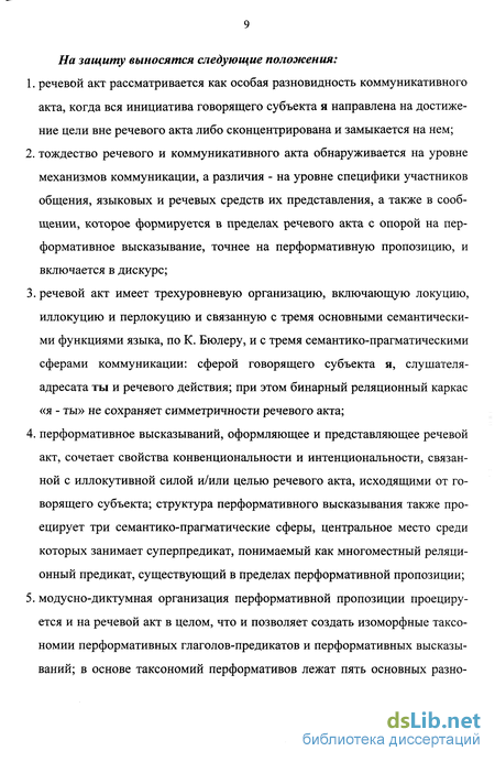 видностей иллокутивной цели: ассертивная, комиссивная, директивная, декларативная и экспрессивная; 6. комплекс языковых средств, оформляющих перформативное высказывание и речевой акт, опирается на прагматическую парадигму - парадигму эгоцентрических слов, поэтому реляционный каркас «я - ты» задает одновременно субъективность и полярность, конвенциональность и интенцио-нальность, аутореферентность и самоверифицируемость как существенные свойства речевого акта и перформативного высказывания, в то время как перформативные предикаты носители дескриптивного и перформативного значений - представляют их номинативную основу.