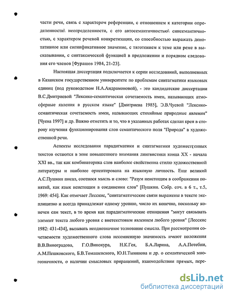 Настоящая диссертация подключается к серии исследований, выполненных в Казанском государственном университете по проблемам синтагматики языковых единиц (под руководством Н.А.Андрамоновой), - это кандидатские диссертации В.С.Дмитриевой "Лексико-семантическая сочетаемость имен, называющих атмосферные явления в русском языке" [Дмитриева 1985], Э.В.Чуевой "Лексико-семантическая сочетаемость имен, называющих стихийные природные явления" [Чуева 1997] и др. Важно отметить и то, что в указанных работах сделан крен в сторону изучения функционирования слов семантического поля "Природа" в художественной речи.