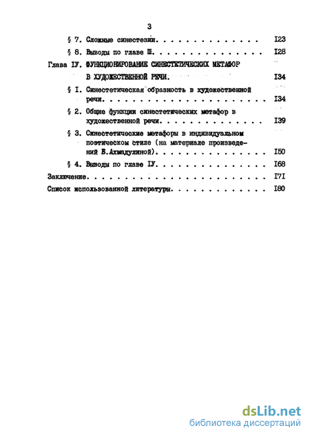 В Первой главе дается общая характеристика понятия синестезии и различных подходов к ее изучению; рассматриваются языковые синестетические метафоры с точки зрения их структурной и семантической организации. Во Второй главе предлагается структурная классификация симестетических метафор. Третья глава посвящена их семантической организации. В Четвертой главе описывается художественная синестезия, ее характерные признаки, особенности ее проявления в разные исторические периоды и у разных авторов;рассматриваются вопросы функционирования синестетических метафор в художественной речи и, в частности, в индивидуальном поэтическом стиле Б.Ахмадулиной. В Заключении подводятся итоги исследования.