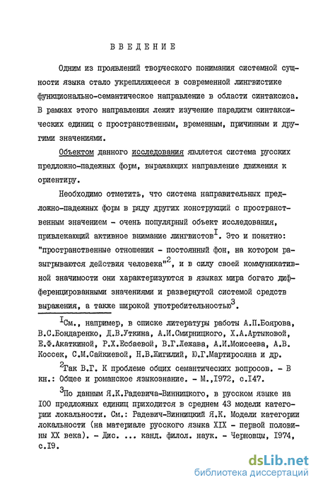В языковедческих исследованиях пространственные конструкции выступают в качестве самостоятельного объекта наблюдений, а также привлекают интерес специалистов в связи с изучением других лингвистических вопросов: семантики и сочетаемости глаголов (выделение ЛСГ глаголов движения) , их словообразо-вательных и морфологических особенностей ; проблемы валентности в русле теории управления как типа синтаксической связи ; определения природы основных единиц синтаксиса (словосочетания, синтаксической формы слова)4, теории членов предложе-ния и многих других.