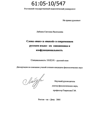 Теоретическая значимость работы состоит в том, что решение проблемы сходства и различия «так», «такой» как синтаксических единиц, предназначенных для выражения эмоциональной оценки, для передачи того или иного значения, что позволяет в какой-то мере решить проблему выбора говорящим (в зависимости от его иллокутивного замысла, стиля повествования) того или иного слова, т.е. имеется в виду и антпропоцентрический аспект анализа; показана целесообразность объединения местоименных слов «так» и «такой» не только на основе их анафорических и дейктических функций) но и на основе других общих для них синтаксических текстообразующих функций. Практическая ценность диссертации заключается в том, что материалы и выводы работы могут быть использованы в лексикографической практике при составлении словарей русской разговорной речи, устойчивых высказываний эмоционально-оценочного типа; а также в дальнейших научных исследованиях единиц «так» и «такой»-, в практике вузовского преподавания современного русского языка, при обучении русскому языку в педколледжах — при изучении курсов «Лексика», «Стилистика», «Синтаксис».