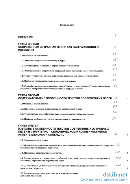 Диссертационное исследование посвящено выявлению содержательных и языковых особенностей текстов современных эстрадных песен как произведения массового искусства.