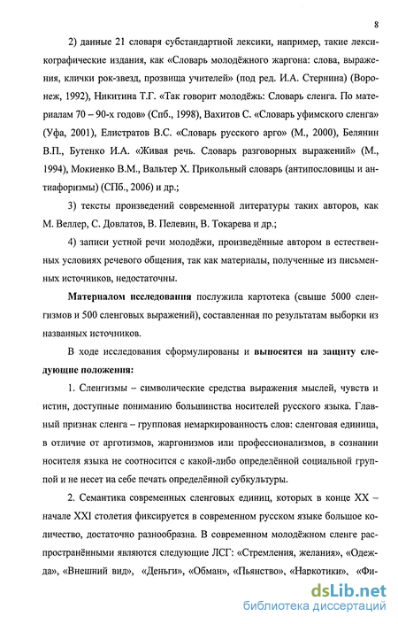 Материалом исследования послужила картотека (свыше 5000 слен-гизмов и 500 сленговых выражений), составленная по результатам выборки из названных источников.
