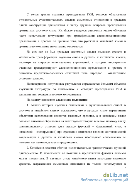 Практическая значимость. Овладение научным стилем речи является важнейшей задачей для иностранных учащихся. Результаты диссертации могут быть использованы в практике преподавания русского языка китайским учащимся, в учебных пособиях для китайских учащихся продвинутого этапа обучения, а также в курсе перевода. Ум е н и е оперировать данными сочетаниями в научном стиле является показателем уровня владения научным стилем русского языка для иностранных учащихся. Кроме того, данное исследование может быть полезно преподавателям РКИ, так как содержит лингводидактическую модель обучения китайских учащихся приемам синтаксической конденсации в научном стиле речи русского языка.