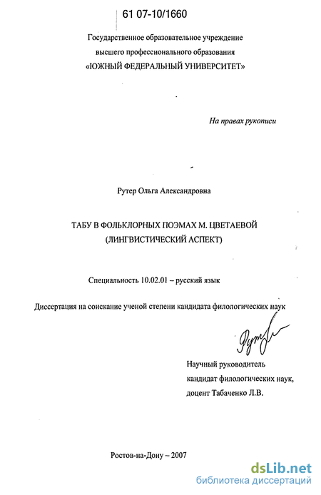Табу (в широком смысле) является объектом исследования нескольких наук: религиоведения, истории, этнологии, психологии и т.д., причем в этих науках оно исследовано подробно. В современной лингвистике разработан более узкий аспект — вербальное табу, но только как явление современного языка, то есть как запрет на употребление определенных слов, вызванный в основном социальными факторами: этикетом, цензурой и т.д. Словесное табу в исторически первичном значении (как обусловленное религиозно-мировоззренческими архаическими требованиями) не привлекает внимания ученых как, видимо, не актуальное для языка на современном этапе. Между тем в поэмах М. Цветаевой, написанных на народные сюжеты, табу является одним из ярчайших языковых приемов. Оно сочетает архаические черты с индивидуально-авторскими особенностями и играет одну из основных смыслообразующих ролей, поэтому явление табуирования в фольклорных поэмах М. Цветаевой должно быть проана-