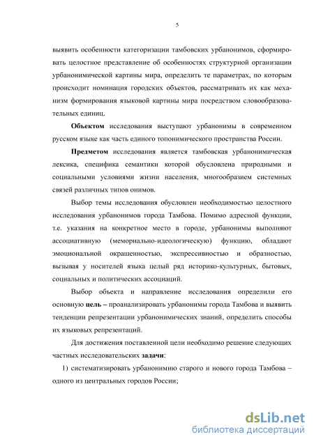 определить особенности формирования тамбовских урбанонимов как лингвистической категории в когнитивном аспекте, обеспечивающих формирование топонимического ландшафта города Тамбова, на следующих уровнях: лексического значения, деривационной структуры, мотивационном и концептуальном;