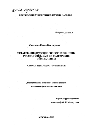Стоянова Елена Викторовна. Устаревшие фразеологические единицы русского языка и их болгарские эквиваленты : диссертация ... кандидата филологических наук : 10.02.01.- Москва, 2002.- 235 с.: ил. РГБ ОД, 61 02-10/931-2