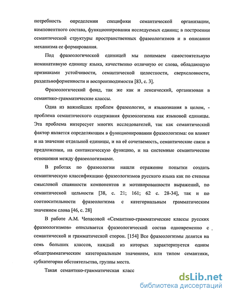 В работе A.M. Чепасовой «Семантико-грамматические классы русских фразеологизмов» описывается фразеологический состав одновременно с семантической и грамматической сторон. [154] Все фразеологизмы делятся на семь больших классов, каждый из которых характеризуется одним общеграмматическим категориальным значением, или типом семантики, субкатегории обстоятельства, группы места.