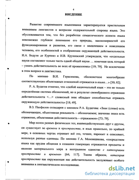 Мир полон разных физических тел, взаимодействующих друг с другом, он существует во времени и пространстве, и язык правильно, по крайней мере, в основных чертах отражает всё это, точнее, нарекает и описывает, используя разные единицы. По мнению Г.А. Меновщикова, «посредством языка как орудия общения в сознании говорящих отражаются предметы и явления материального мира в неотрывном единстве с категориями пространства и времени» [64; 117]. Таким образом, категория пространства как окружающая нас действительность заслуживает особого внимания в лингвистическом исследовании. Актуальность темы. Категория пространства стала предметом пристального внимания многих учёных-лингвистов (Р.А. Агеева [1], Ю.Д. Апресян [5], Д.И. Арбатский [6], Брутян Г.А. [17], Т.В. Булыгина, А.Д. Шмелёв [20], Е.П. Воронцова [25], М.В. Всеволодова, Е.Ю. Владимирский [27], Е.С. Кубрякова [65], Ли Тоан Тханг [56], М.В. Маковицкий [61], Н. Новикова, Н. Черемисина [70], М.Ф. Панкина [72], З.Д. Попова [76], Н.А. Слюсарева [93], Е.С. Яковлева [127] и др.).