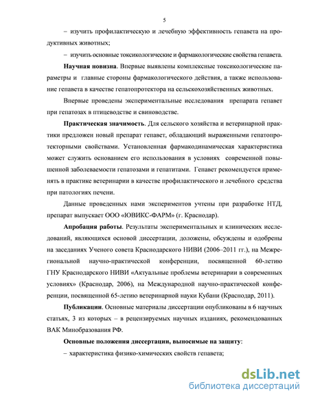 Научная новизна. Впервые проведены комплексные токсикологические исследования и изучены основные стороны фармакологического действия гепавета, а также использование препарата в качестве гепатопротектора на сельскохозяйственных животных.