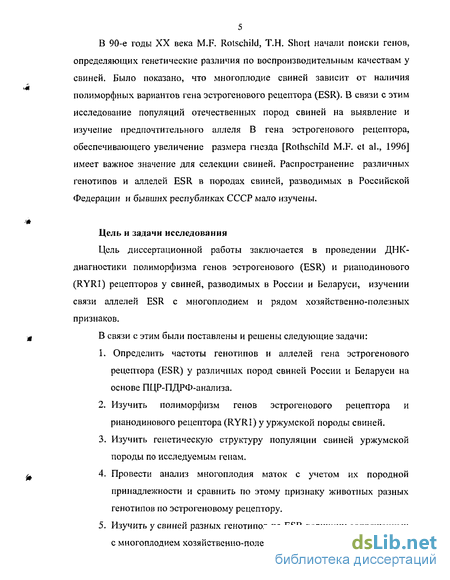 5 В 90-е годы XX века M.F. Rotschild, Т.Н. Short начали поиски генов, определяющих генетические различия по воспроизводительным качествам у свиней. Было показано, что многоплодие свиней зависит от наличия полиморфных вариантов гена эстрогенового рецептора (ESR). В связи с этим исследование популяций отечественных пород свиней на выявление и изучение предпочтительного аллеля В гена эстрогенового рецептора, обеспечивающего увеличение размера гнезда [Rothschild M.F. et al., 1996] имеет важное значение для селекции свиней. Распространение различных генотипов и аллелей ESR в породах свиней, разводимых в Российской Федерации и бывших республиках СССР мало изучены.