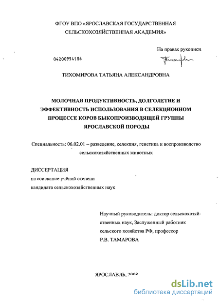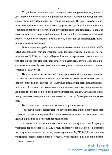 Цель н задачи исследований. Цель исследований - оценить в динамике генетический потенциал коров ярославской породы, отобранных для заказных спариваний, изучить их молочную продуктивность, продолжительность хозяйственного использования и племенные качества, определить селекционный и экономический эффект в племенных стадах, установить влияние различных факторов на продуктивное долголетие быкопроизводящих коров.
