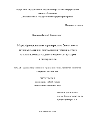 биоэнергетическую характеристику биологически активных точек в области крестца и промежности для прогнозирования, диагностики и терапии послеродового острого катарального эндометрита у коров. Настоящая работа является самостоятельным разделом общей комплексной темы кафедры Незаразных болезней, хирургии и акушерства Приморской государственной сельско-хозяйственной академии.