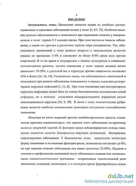 Цель и задачи исследования. Цель настоящих исследований выяснить эпизоотологические и морфофункциональные аспекты пневмонии у телят вызванной ассоциацией вируса парагриппа -3, Mycoplasma bovis и Haemophilus somnus, испытать экспресс методы диагностики данной ассоциации, обосновать схемы лечения.