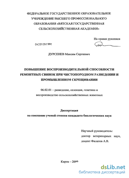 Цель и задачи исследований. Целью настоящих исследований явилось изучение путей повышения воспроизводительной способности ремонтного молодняка при чистопородном разведении и промышленном скрещивании в условиях промышленного свиноводства.