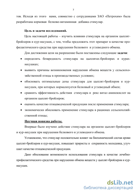 обосновать оптимальные дозы стимулара для цыплят-бройлеров и кур-несушек, при которых нормализуется белковый и углеводный обмен;