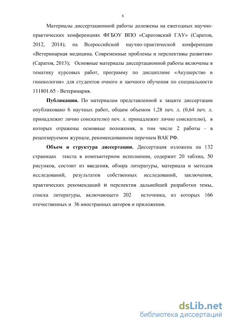 Материалы диссертационной работы доложены на ежегодных научно-практических конференциях ФГБОУ ВПО «Саратовский ГАУ» (Саратов, 2012, 2014); на Всероссийской научно-практической конференции «Ветеринарная медицина. Современные проблемы и перспективы развития» (Саратов, 2013); Основные материалы диссертационной работы включены в тематику курсовых работ, программу по дисциплине «Акушерство и гинекология» для студентов очного и заочного обучения по специальности 111801.65 - Ветеринария.