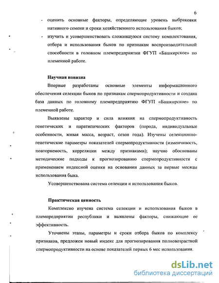 Впервые разработаны основные элементы информационного обеспечения селекции быков по признакам спермопродуктивности и создана база данных по головному племпредприятия ФГУП «Башкирское» по племенной работе.