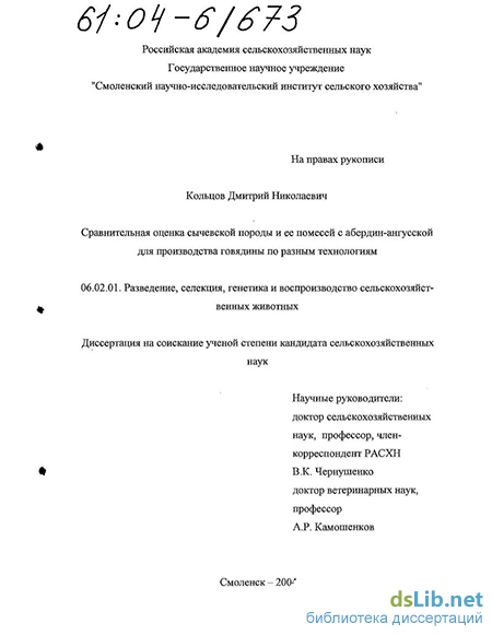 Кольцов Дмитрий Николаевич. Сравнительная оценка сычевской породы и ее помесей с абердин-ангусской для производства говядины по разным технологиям : Дис. ... канд. с.-х. наук : 06.02.01 : Смоленск, 2004 156 c. РГБ ОД, 61:04-6/673