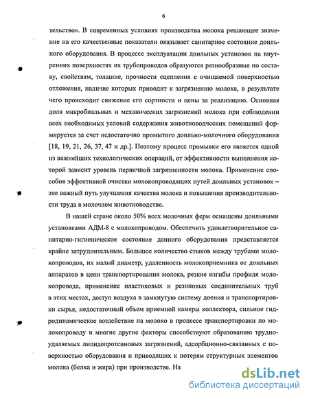 В нашей стране около 50% всех молочных ферм оснащены доильными установками АДМ-8 с молокопроводом. Обеспечить удовлетворительное санитарно-гигиеническое состояние данного оборудования представляется крайне затруднительным. Большое количество стыков между трубами моло-копроводов, их малый диаметр, удаленность молокоприемника от доильных аппаратов в цепи транспортирования молока, резкие изгибы профиля моло-копровода, применение пластиковых и резиновых соединительных труб в этих местах, доступ воздуха в замкнутую систему доения и транспортировки сырья, недостаточный объем приемной камеры коллектора, сильное гидродинамическое воздействие на молоко в процессе транспортировки по молокопроводу и многие другие факторы способствуют образованию трудно-удаляемых липидопротеиновых загрязнений, адсорбционно-связанных с поверхностью оборудования и приводящих к потерям структурных элементов молока (белка и жира) при производстве. Наиболее совершенным на данный