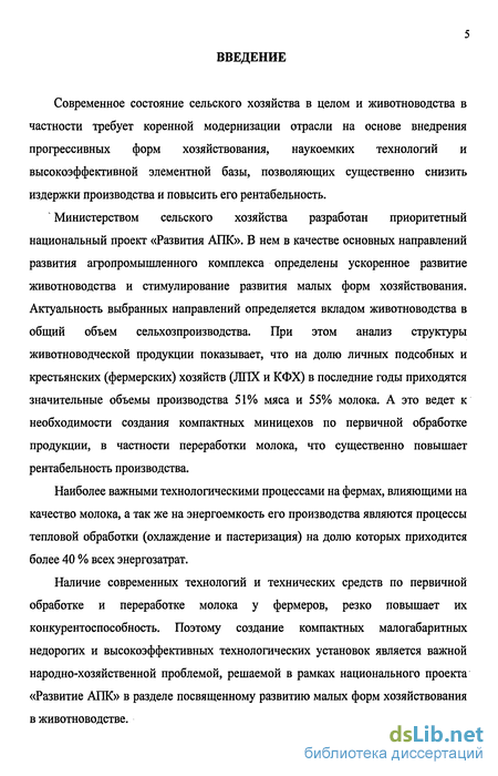 Министерством сельского хозяйства разработан приоритетный национальный проект «Развития АПК». В нем в качестве основных направлений развития агропромышленного комплекса определены ускоренное развитие животноводства и стимулирование развития малых форм хозяйствования. Актуальность выбранных направлений определяется вкладом животноводства в общий объем сельхозпроизводства. При этом анализ структуры животноводческой продукции показывает, что на долю личных подсобных и крестьянских (фермерских) хозяйств (ЛПХ и КФХ) в последние годы приходятся значительные объемы производства 51% мяса и 55% молока. А это ведет к необходимости создания компактных миницехов по первичной обработке продукции, в частности переработки молока, что существенно повышает рентабельность производства.