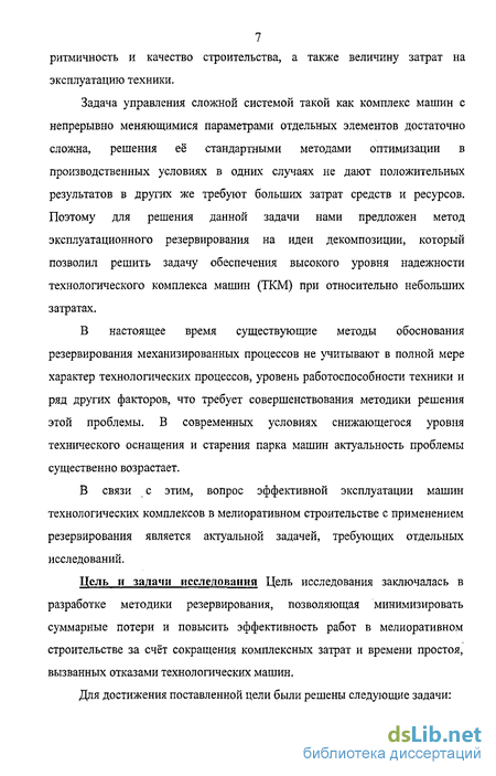Объекты, предмет исследований Объектами исследований явились технология и средства механизации, применяемые для культуртехнических работ при мелиоративном строительстве, где предметом исследования выступает процесс формирования оптимального комплекса мелиоративных и строительных машин на основе резервирования, его организационно-экономические закономерности и влияние надёжности машин на этот процесс при введении резервной техники.