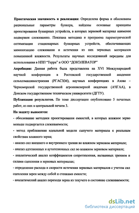 Предмет исследования: Закономерности взаимодействия влажного зернового материала со стенками и выпускным отверстием бункеров. Научная гипотеза: В результате наблюдения в производственных и лабораторных условиях за истечением влажного зерна из емкостей было предположено, что основную роль при переходе его в состояние слеживания играют силы сцепления зерен между собой и стенками емкости. Учет этих сил позволит исследовать переходные процессы и определить оптимальную форму емкостей для кратковременного или длительного хранения зерна. Научная новизна: Предложены и обоснованы параметры и форма емкостей, в которых зерновая масса меньше подвергается слеживаемости. Определены основные закономерности истечения сыпучего зернового материала и влияние формы и параметров бункера на процесс истечения. Смоделирован физико - механический процесс перехода влажного зернового материала из текучего состояния в состояние слеживаемости. Учтены физические параметры влажного зерна, характеризующие состояние слеживаемости.