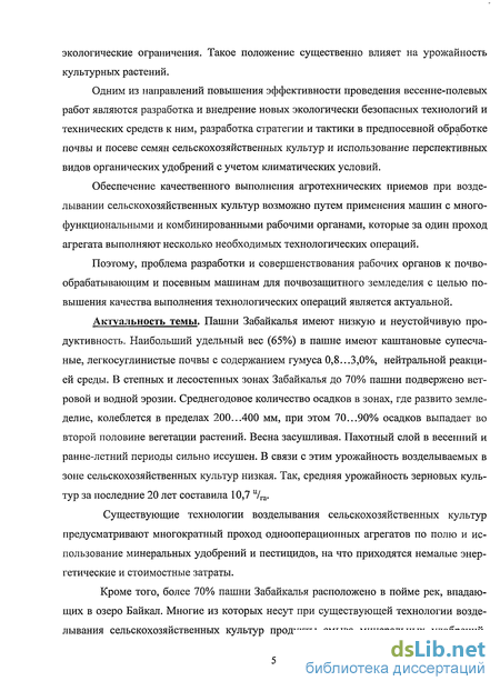 Актуальность темы. Пашни Забайкалья имеют низкую и неустойчивую продуктивность. Наибольший удельный вес (65%) в пашне имеют каштановые супесчаные, легкосуглинистые почвы с содержанием гумуса 0,8...3,0%, нейтральной реакцией среды. В степных и лесостепных зонах Забайкалья до 70% пашни подвержено ветровой и водной эрозии. Среднегодовое количество осадков в зонах, где развито земледелие, колеблется в пределах 200...400 мм, при этом 70...90% осадков выпадает во второй половине вегетации растений. Весна засушливая. Пахотный слой в весенний и ранне-летний периоды сильно иссушен. В связи с этим урожайность возделываемых в зоне сельскохозяйственных культур низкая. Так, средняя урожайность зерновых культур за последние 20 лет составила 10,7 ц/га.